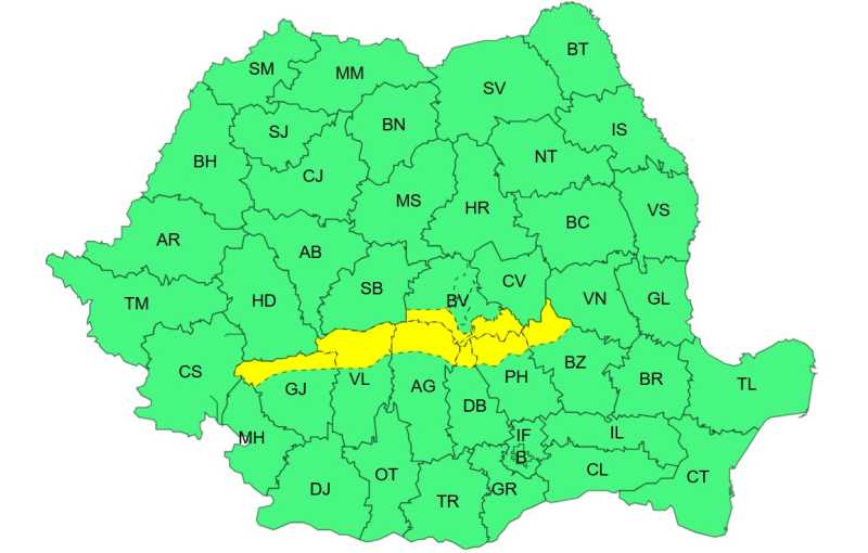 Administrația Națională de Meteorologie a emis o atenționare Cod galben de ploi însemnate cantitativ, valabilă în următoarele 24 de ore în zona montană a județelor Gorj, Vâlcea, Argeș, Dâmbovița, Prahova, Buzău și Brașov.